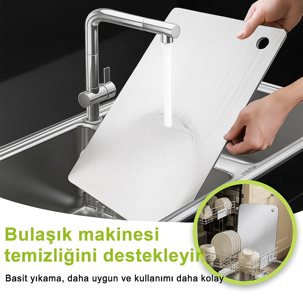 Kesinlikle! Dimo™ Paslanmaz Çelik Kesme Tahtası, bulaşık makinesinde yıkanmaya tamamen uygundur. Yoğun mutfak temponuzda size zaman kazandırır ve her yıkamada derinlemesine temizlik sağlar. Pratikliği ve hijyeni bir arada sunar.
