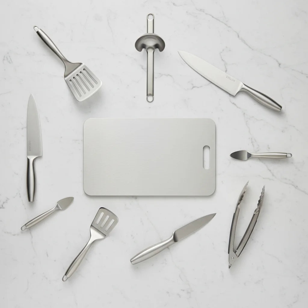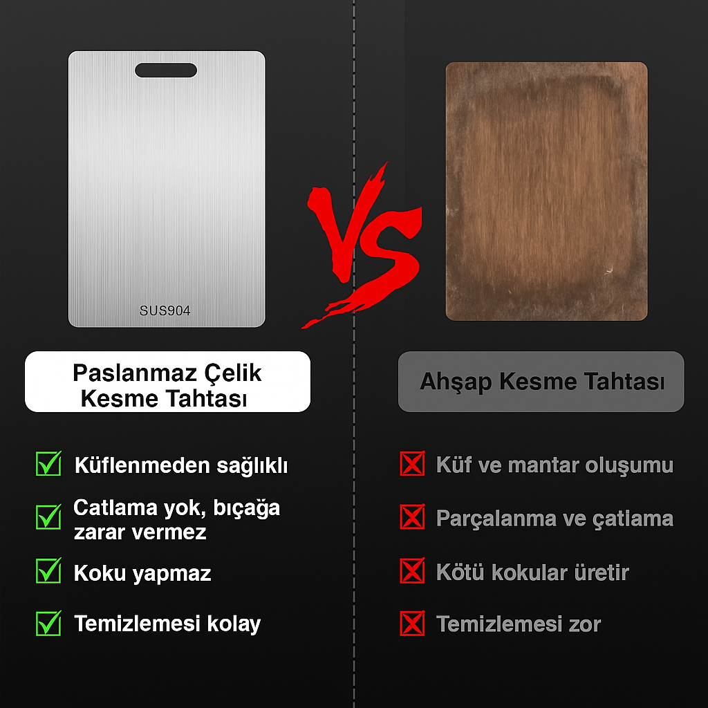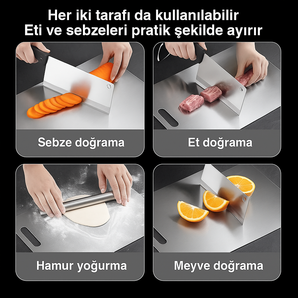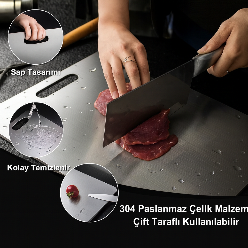 Bu sadece bir kesme tahtası değil, mutfağının yeni demirbaşı. Paslanmaya karşı dayanıklı 304L paslanmaz çelikten üretildi, yıllarca ilk günkü gibi kalacak. Tek bir tahta al, sonsuza dek kullan. Akıllı mutfakların tercihi.